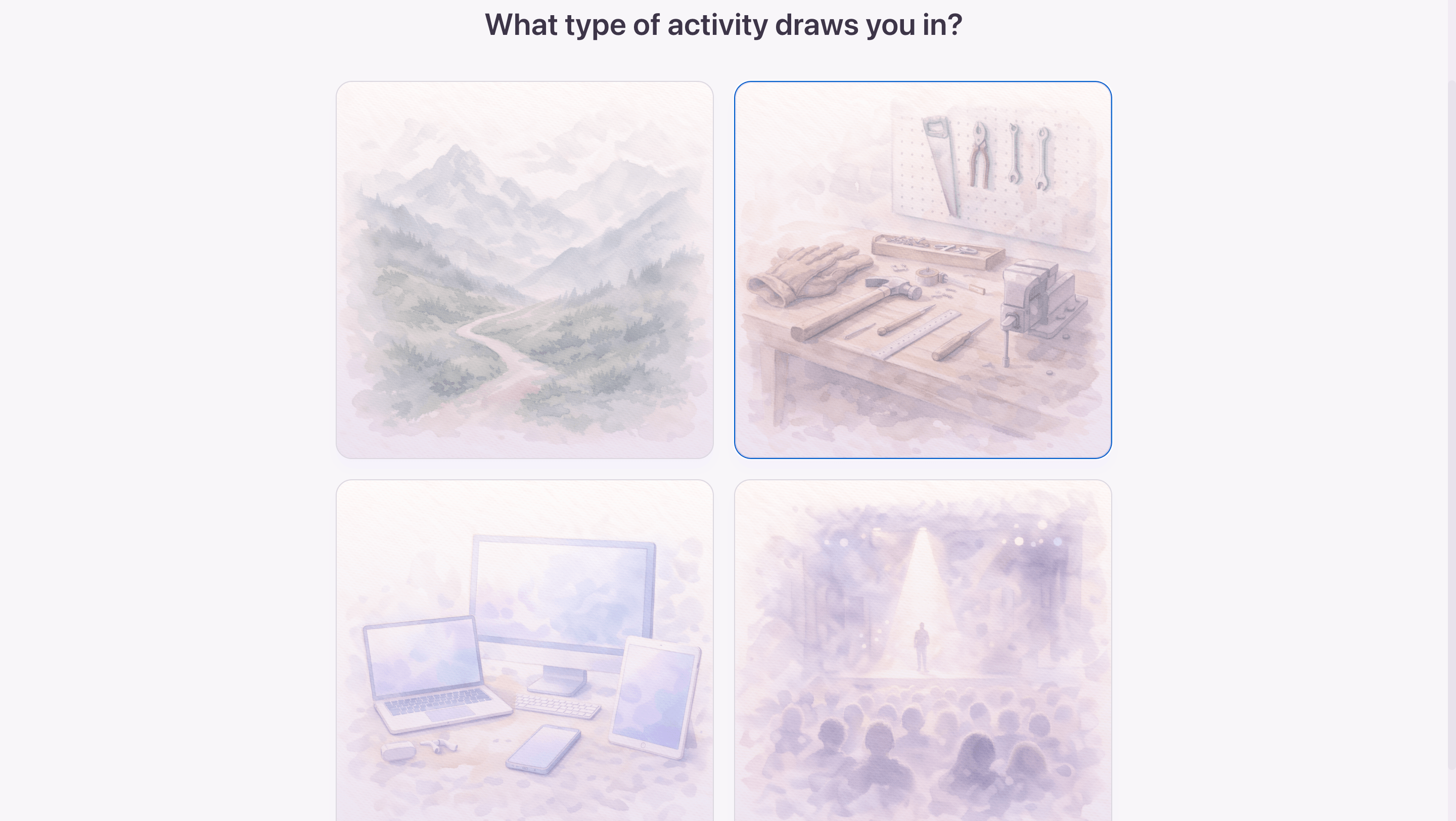 The experience starts with a series of questions, followed by a more visual part using images.
