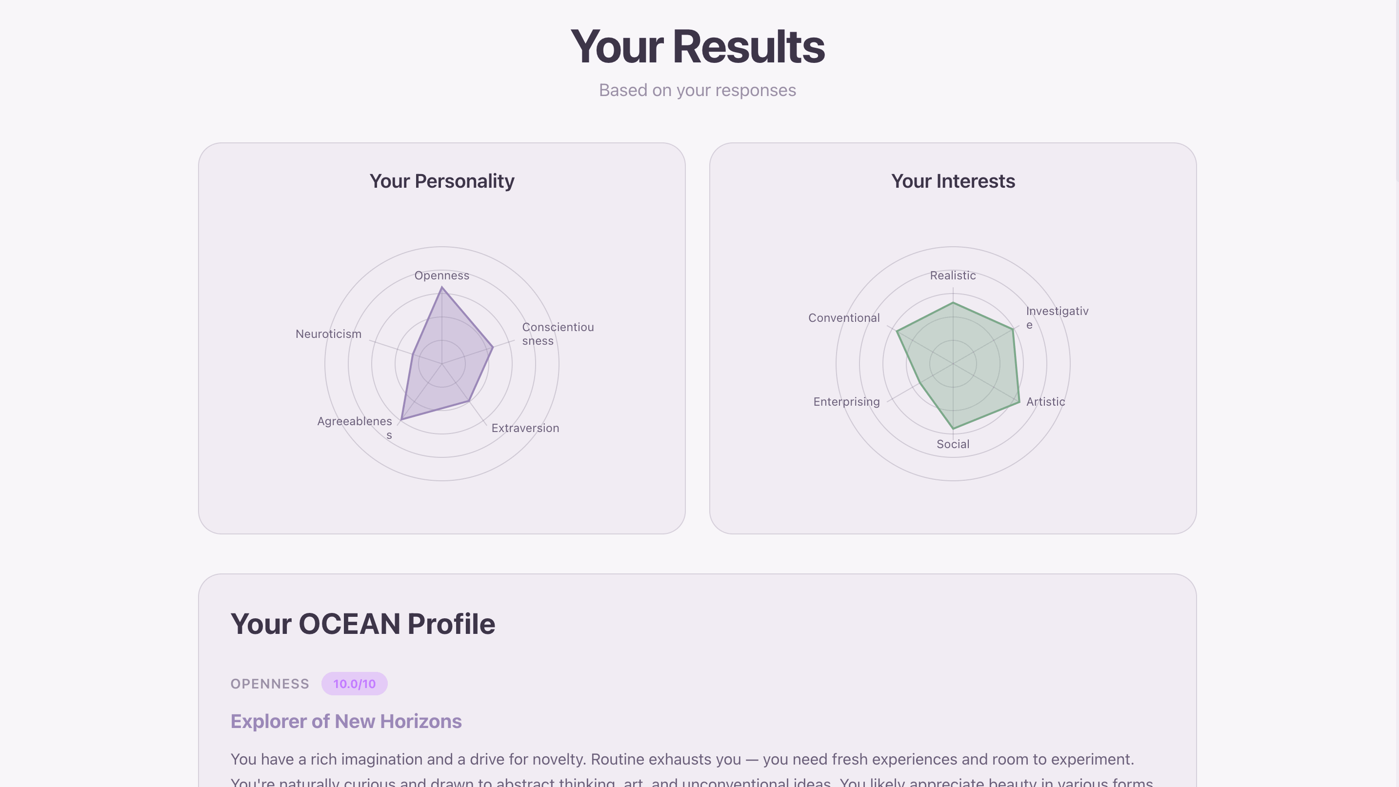 At the end, the quiz describes the person using OCEAN-based text.