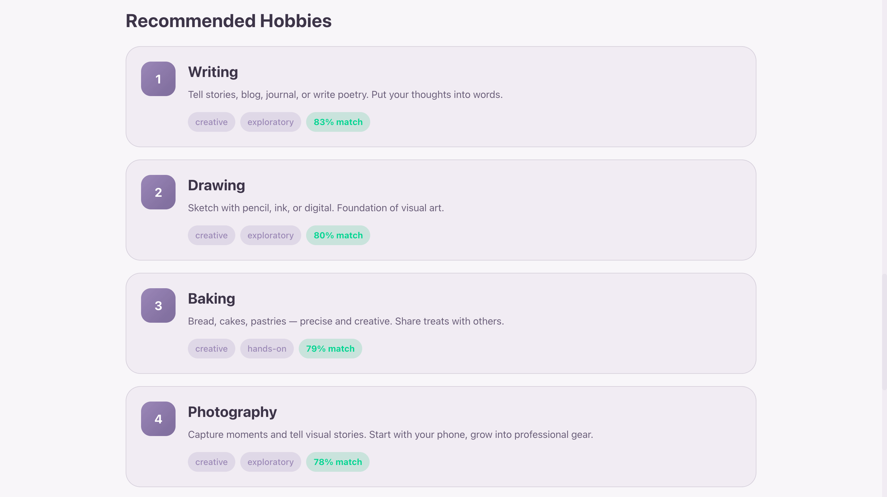 Hobby recommendations are generated using both the OCEAN profile and the aptitude-testing layer. This makes the output more useful than a generic “people like you may enjoy…” list.