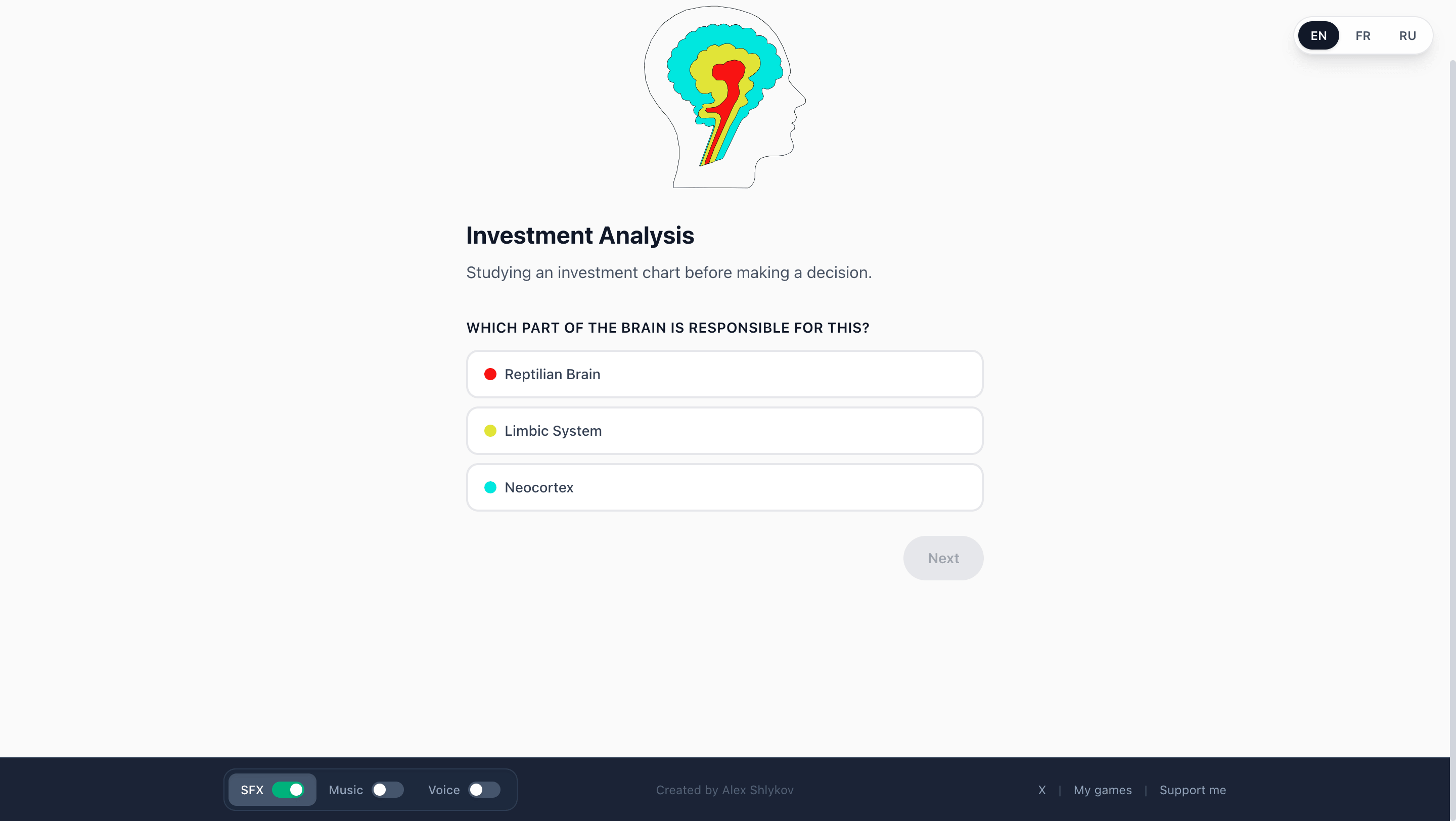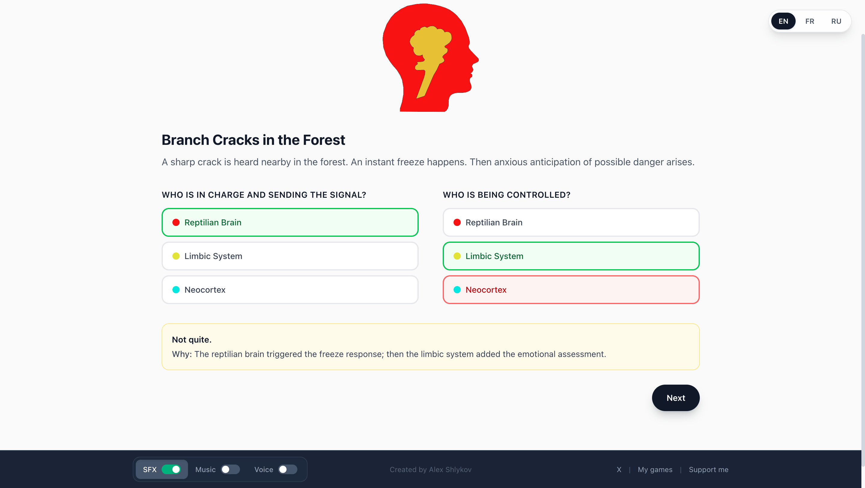 The player chooses which brain system is most responsible for the reaction. After answering, they receive a short explanation.