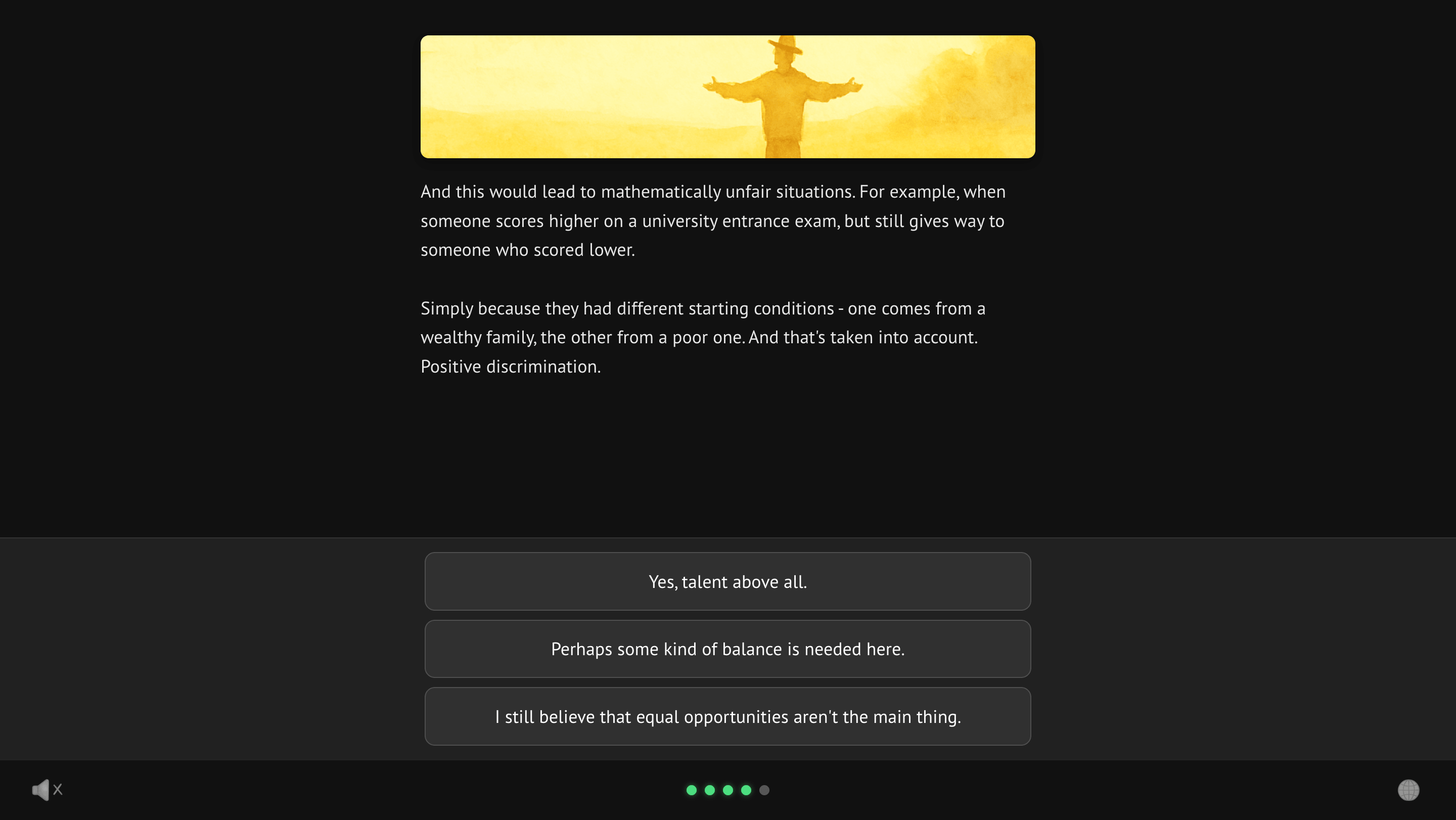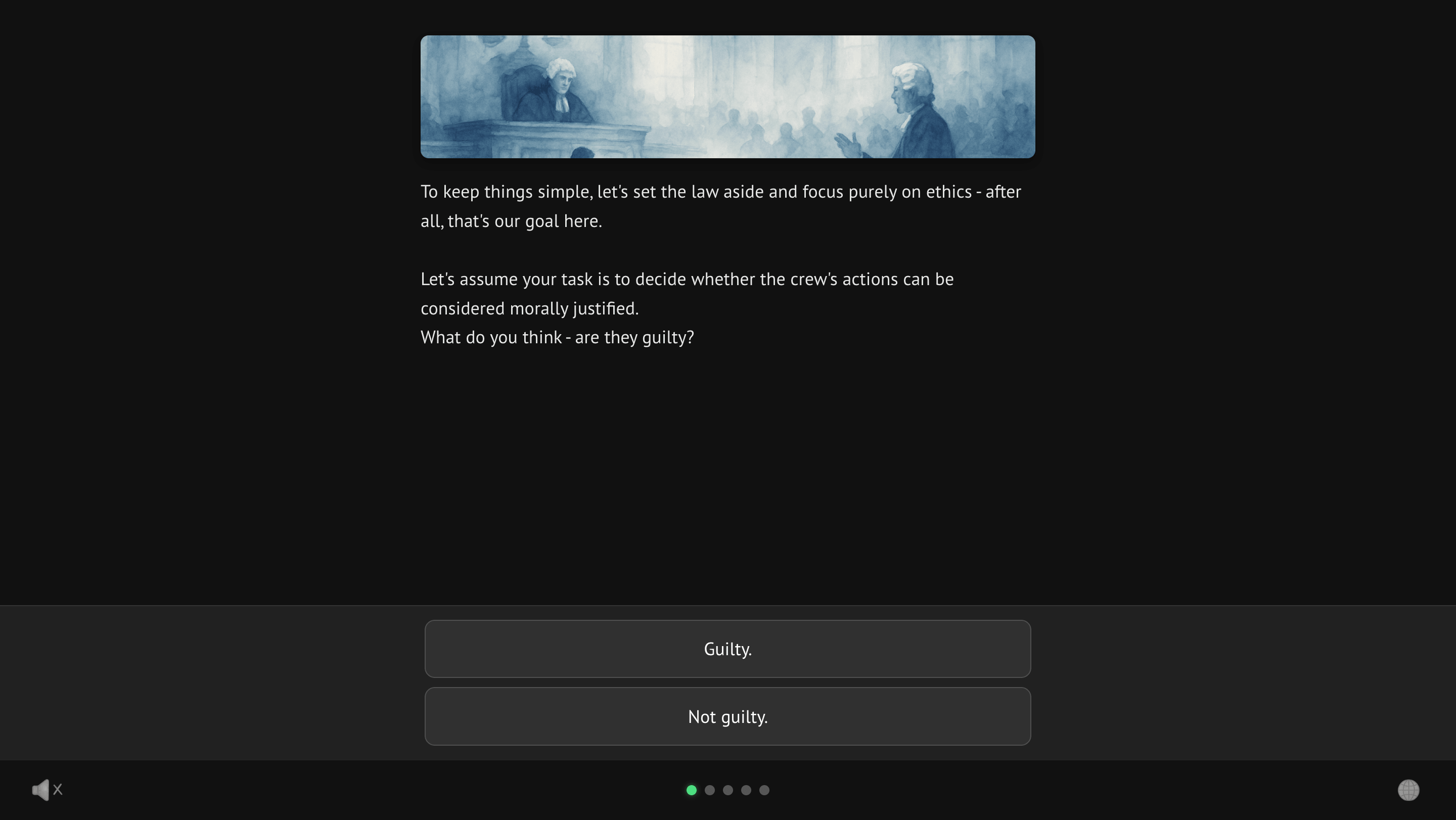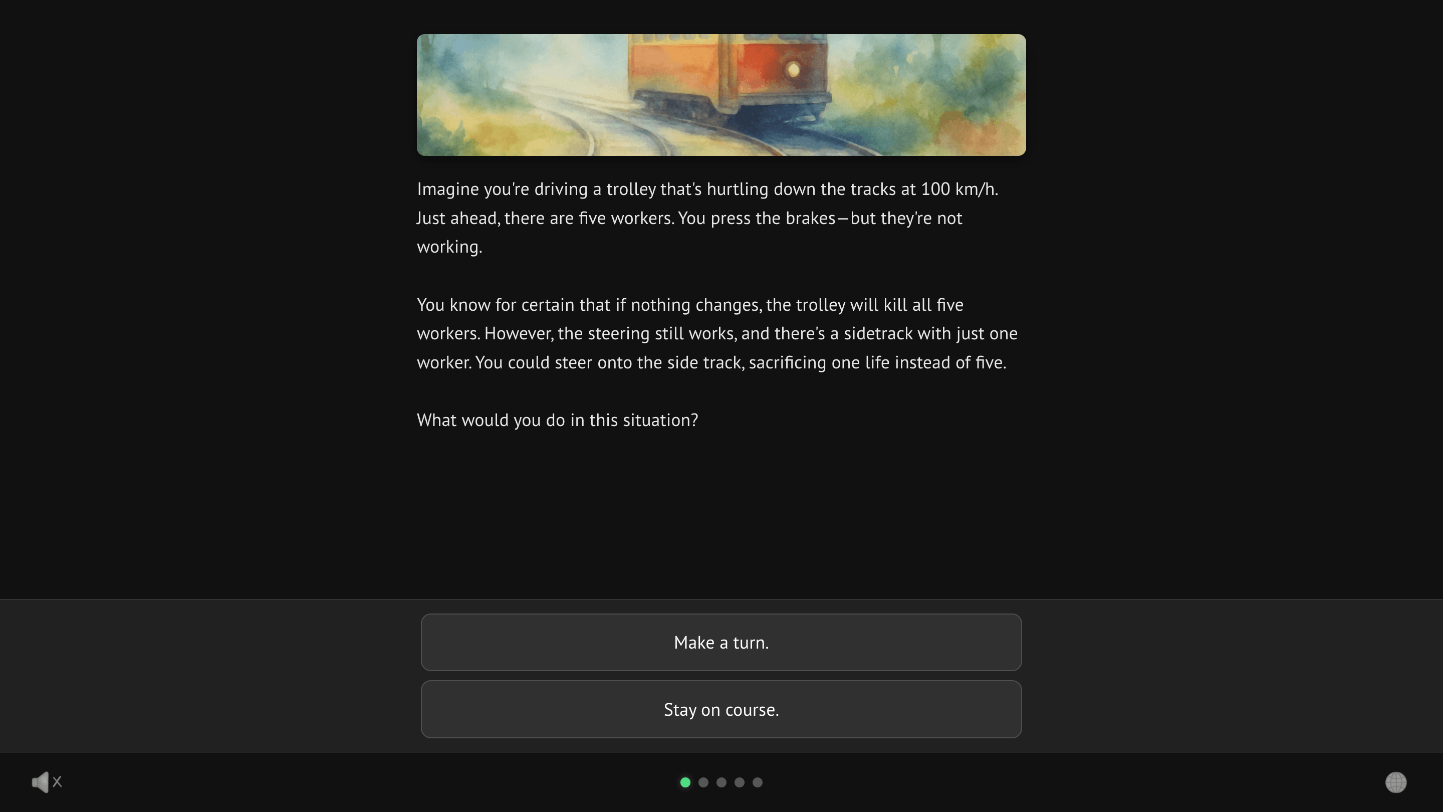 At first I thought about making a game based on the whole course. What came out in the end was closer to a teaser. A smaller interactive experience inspired by the course, with some additional moral dilemmas that were not directly discussed there.