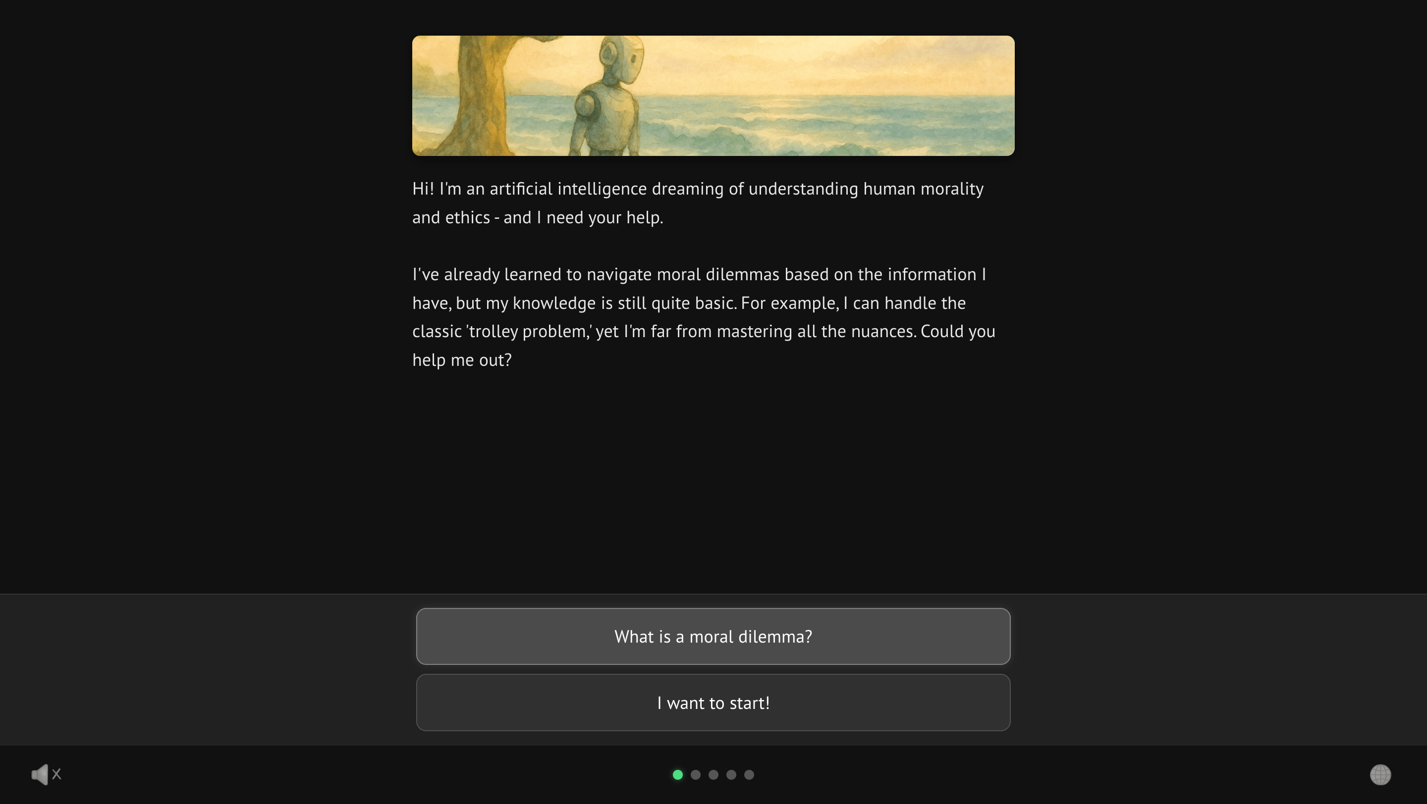 To make the experience more interesting and to give the player more agency, I built a story where the player teaches an AI about human ethics.